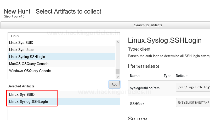 To create a new hunt in the search window start typing Linux then select the artifacts that you want to hunt and add then select “Next”,