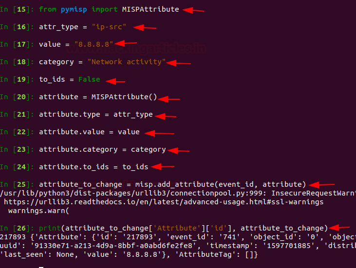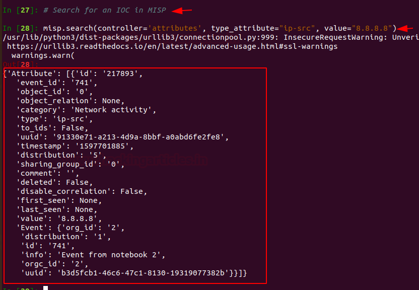 Let’s search for an IOC in MISP ipython interpreter. Run the following command to perform the search.