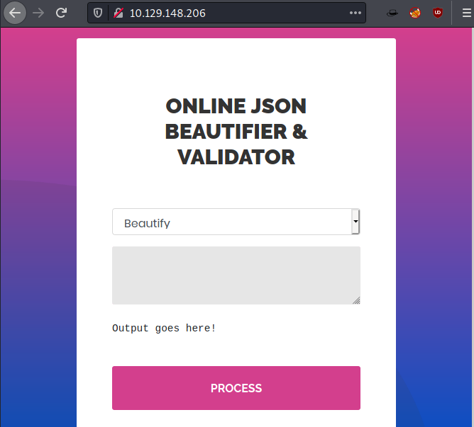 Starting with the HTTP service, we try to enumerate by accessing the IP Address of the target machine on a Web Browser. We see a website that features online Json beautifier and validator.