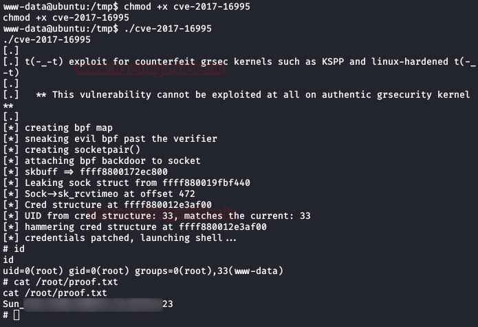 We download the exploit to our machine, compile it, and download it to the victim machine. Now we will give it execution permissions and execute it, this will return a prompt as root and we will read the file “proof.txt“.
