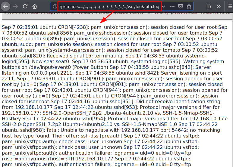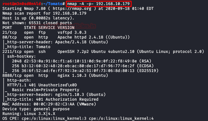 Through nmap we know that port 21, 80, 2211, 8888 are open with the services of FTP, HTTP, SSH, and HTTP respectively. We access the port 80 web service and find a single page with an image of a tomato. After checking the image with several stenographical tools, we did not find anything that could be useful. We even had no luck in the source code.