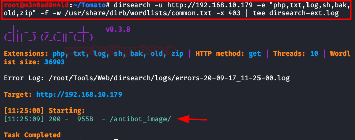 Here, we used dirsearch with the “common” dictionary and specify the most typical extensions. We found the directory “/antibot_image/“.