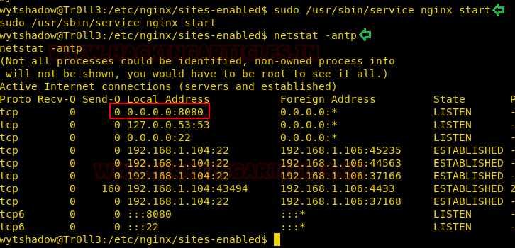 Further, we started the nginx service as shown in the given image. Using the netstat command we saw port 8080 opened. This was not opened when we attempted the nmap scan.