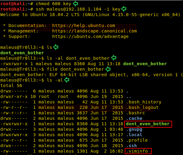 After successfully logging in, we found a file named “don’t_even_bother” that has full permissions and with the help of file we identify its type, it came out to be ELF 64-bit moreover we found another file “.viminfo” file in the same directory.