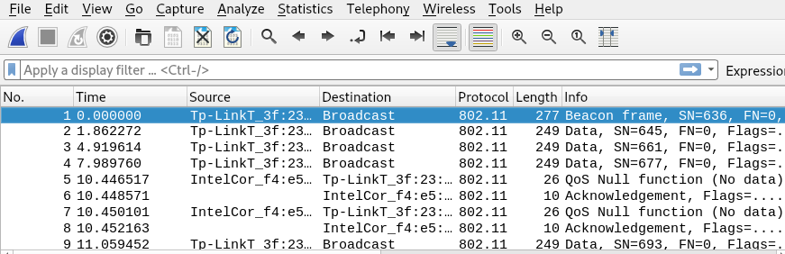 As we have the .cap file, It can be opened with Wireshark, and we found that all the packets have the Protocol marked as “802.11” and captured traffic looks like wireless network packet because as we all know 802.11 is the protocol used for transmission of the packet between wireless connected devices.