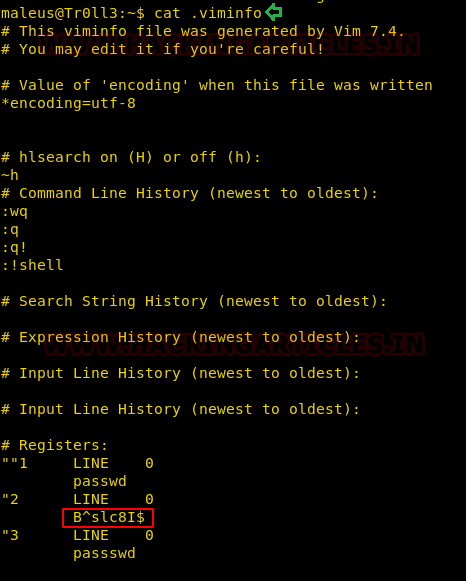 further, we used the cat command to inspect the viminfo file. On close inspection, we found a password for another user “B^slc8I$”. This is a good discovery.