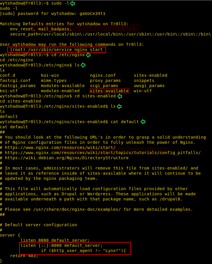 We traversed into the nginx directory and open its config file “sites-enabled sites” file. We see that we have the user agent as Lynx which is listening on 8080.