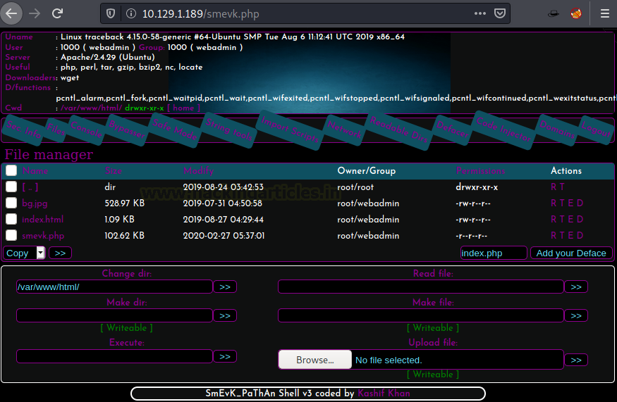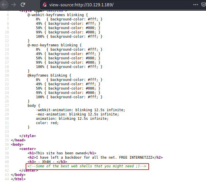 As we don’t have credentials for the SSH, we began enumerating HTTP service. We opened the IP in the Browser to find out that this machine has already been owned. That’s weird for a CTF challenge but so common in real life. Let’s enumerate further.