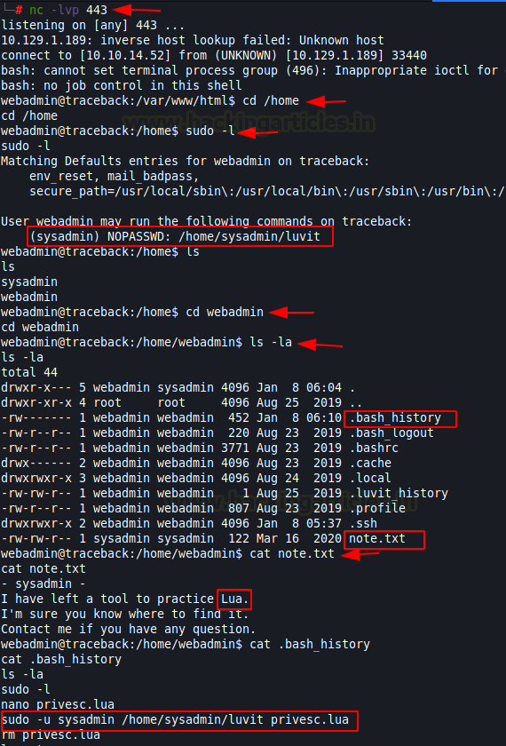 Make sure to open a netcat listener before executing the one-liner on the same port. As soon as the script is executed, we get a shell on our netcat listener. Now that we have the shell, let’s check for sudo permissions for this user. We see that the current user can run luvit as sysadmin without a password. Let’s enumerate further for more clues. We looked around to find a bash_history file and a note. the note mentions Lua as well.