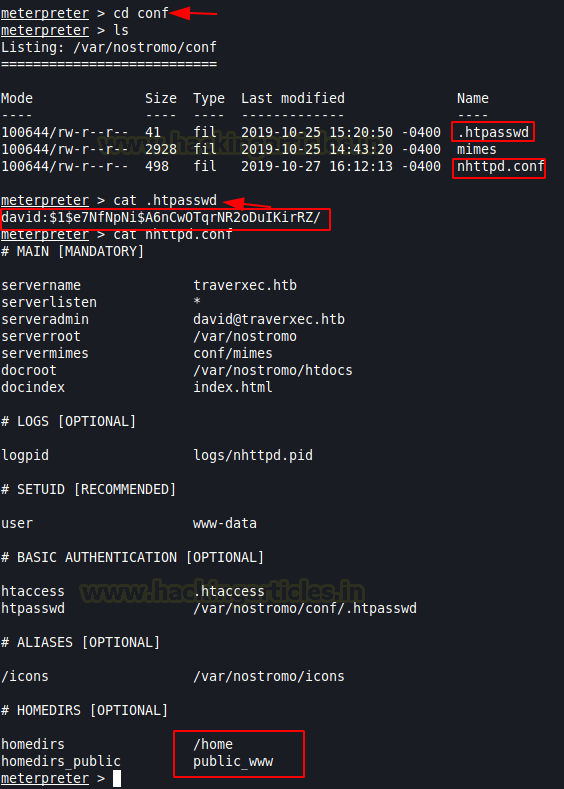 Let’s dive inside the directory named “conf” and while enumerating the file system we found two other files with .conf extension. Now we will use the cat command to view the content present inside .htpasswd file. We found a user named “David” and a hash. Further, we gain uses cat command to view file named nhttpd.conf. Also, we found home directory along with home directory public_www