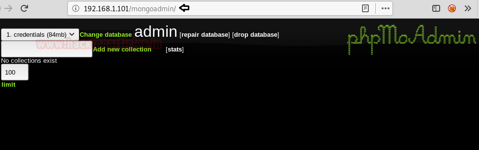 Moving on, Since port 80 is also open. So, we browsed the found directory /mongoadmin/ into the browser. The result displayed is shown in the image. Here we set the change the database to credentials(84mb). It will display a link of 2 Credentials. Click on it.