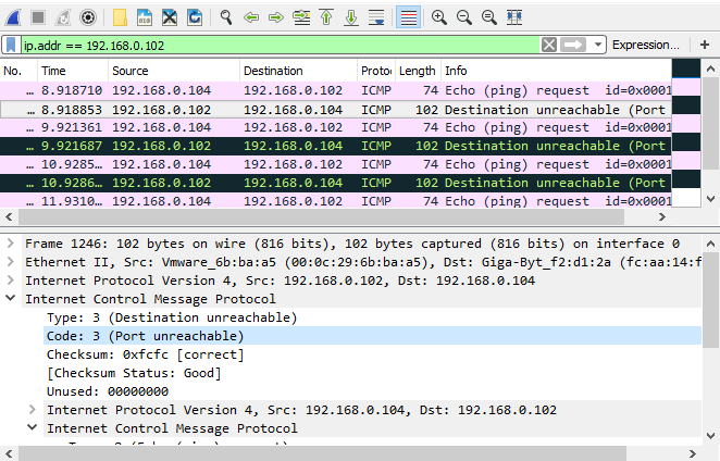 Similarly given below image is showing the detail of 2nd packet i.e. Destination unreachable, you can observe that it is showing ICMP error code: