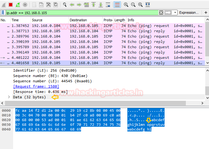 Now let check the information payload carries from source to destination using Wireshark. From the given below image, you can read that highlighted texts are alphabets that have been used as 32 bytes payload.
