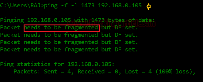 When you set the packet size to 1473 with the (don’t) fragment flag using ping, the router will reject the packet and display an ICMP message indicating that the packet needs fragmentation due to the MTU size limit of 1500 bytes.