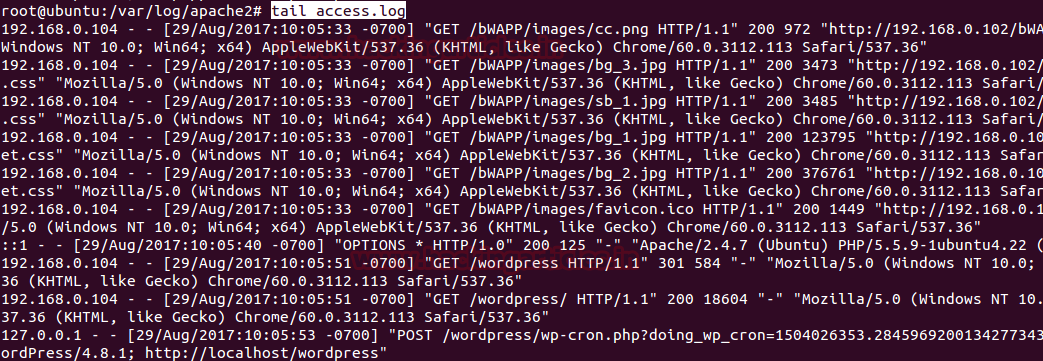 As you know on browser we had browsed web application DVWA, bWAPP and WordPress as respective sequences, therefore we get their log in the same sequence dvwa log at the top; bwapp log at middle and WordPress log at the end of access.log file