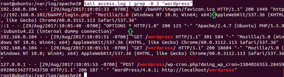 Here -A stand for after, therefore it will filter 2 logs created after bwapp logs and hence it will indicate 2 logs of WordPress as shown in the given image.
