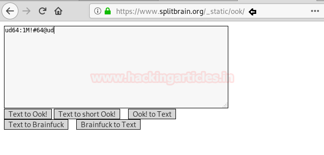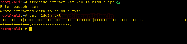 After downloading the image, we use steghide to extract any hidden file from the image. When we try to extract files using steghide, it prompts for a password. We use the password “h1dd3n” we found earlier on the webpage and were successfully able to extract a text file. We take a look at the content of the text file and find a brain fuck encoded string.