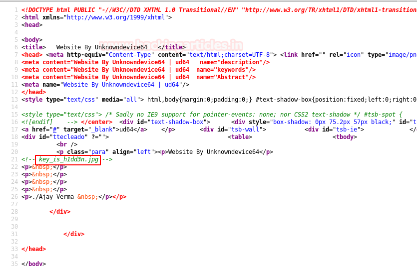 We take a look at the source code of the web page and inside a comment, we find a string called “key_is_h1dd3n.jpg”.