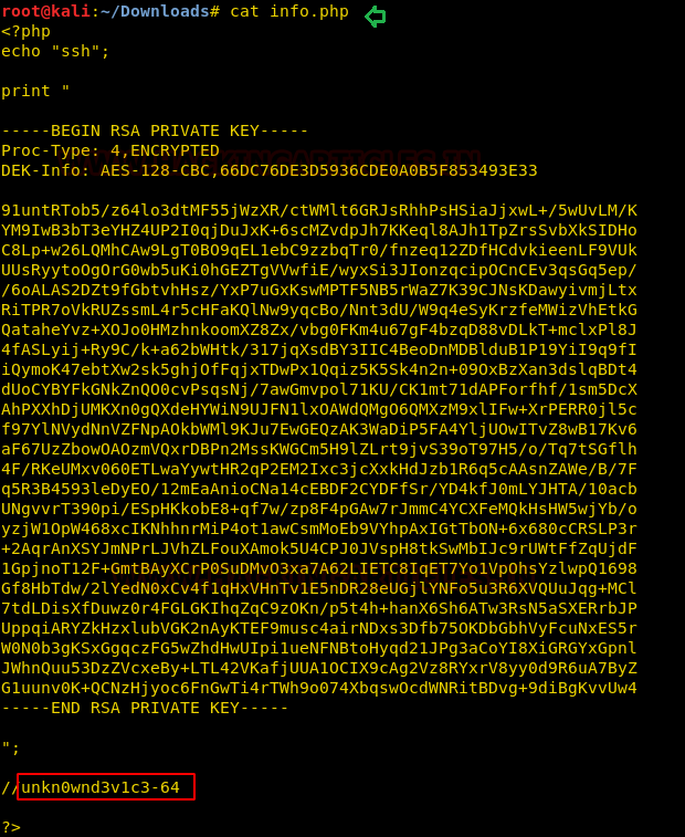 When we open this downloaded file, we got an SSH private key inside it. So, we copied the text from “BEGIN RSA PRIVATE KEY” to “END RSA PRIVATE KEY” and saved it in a file named ‘sshkey’. Besides this key we can see “unkn0wnd3vic3-64” at the end of the file, let’s save this as of now.