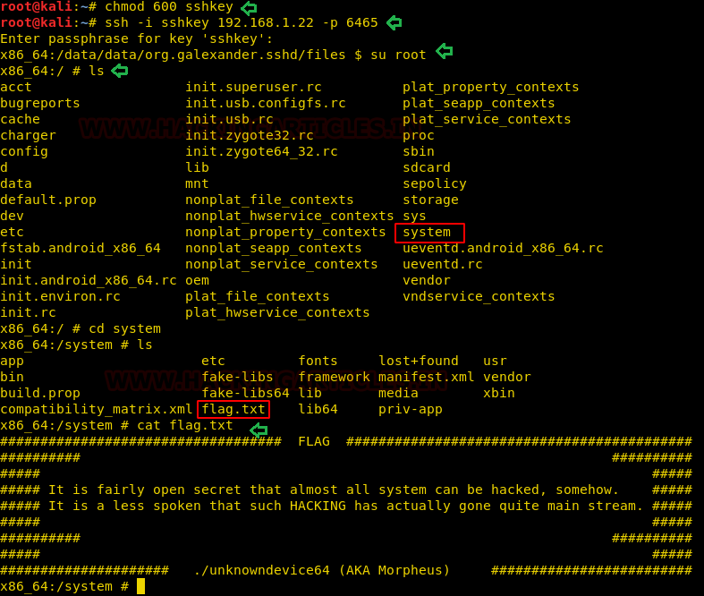 Here first we have changed permission for the file ‘sshkey’. Then login into ssh using this file on port 6465(as ssh is running on port 6465). And we are asked to enter a passphrase for this ssh key.so we used the text “unkn0wnd3vic3-64” that we saved from info.php and it worked. After that, we switched as root user and listed the content of root.
