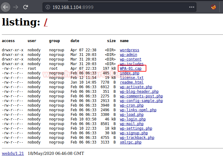 Further on enumerating port 8999, the resultant page come up with the WordPress files and here WPA-01.cap file looks interesting; I download it to find out some clue.