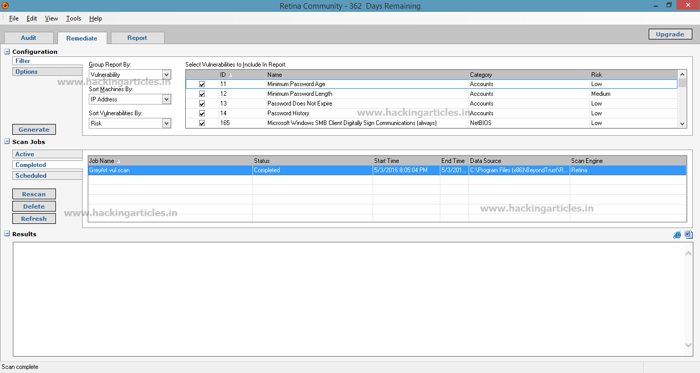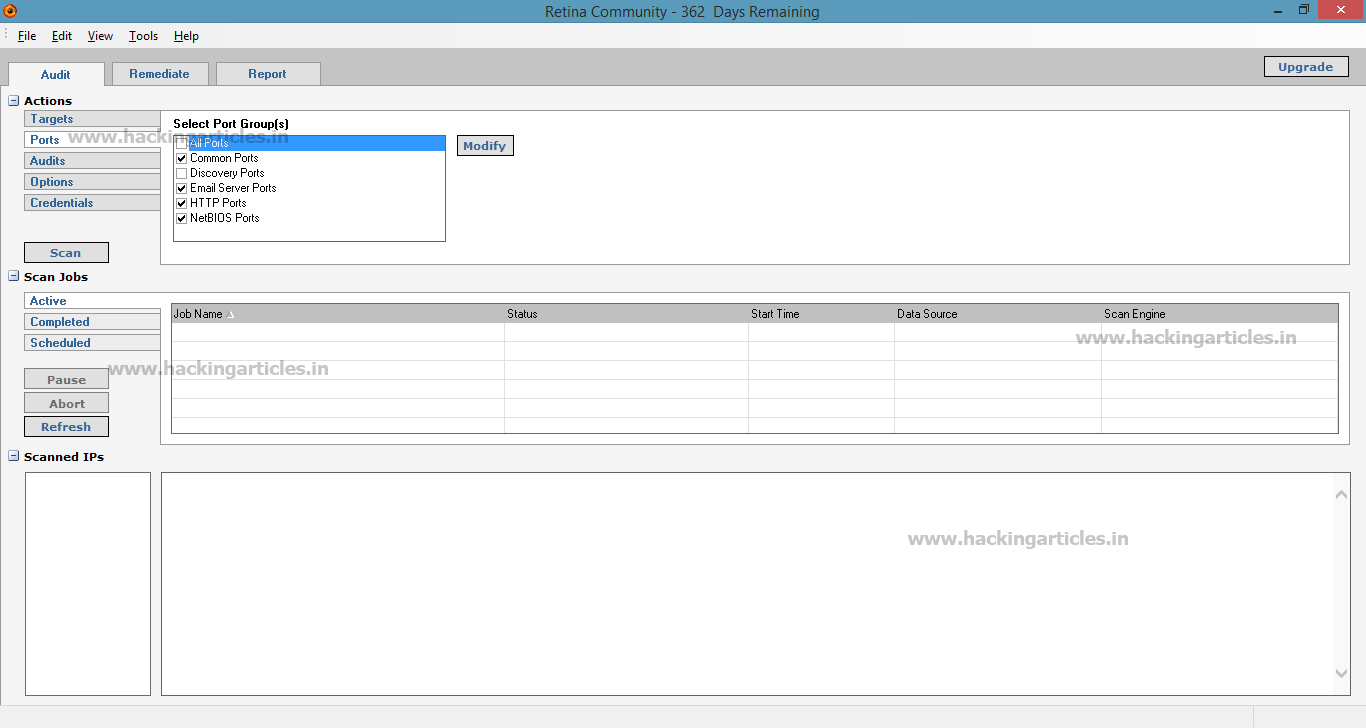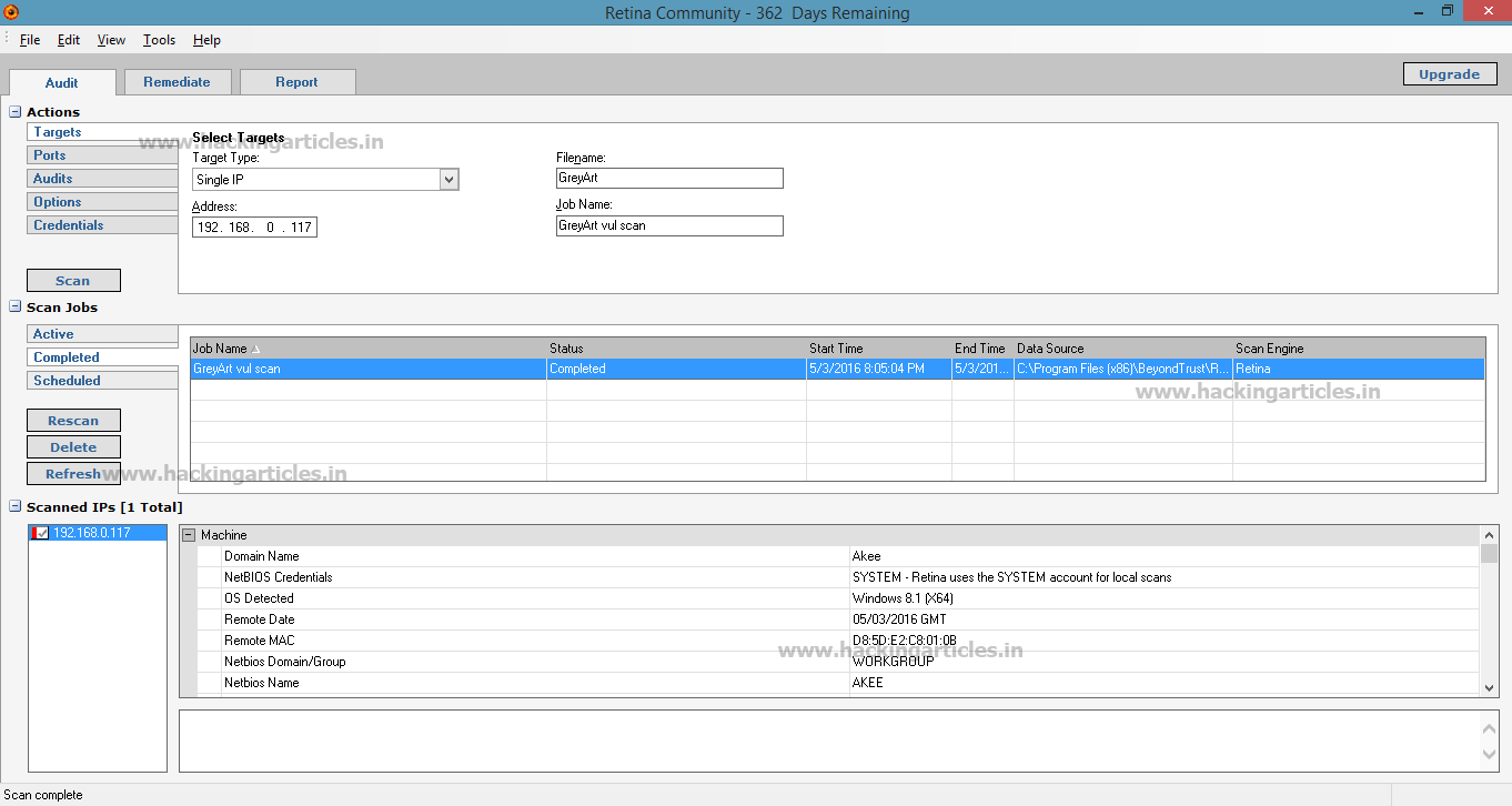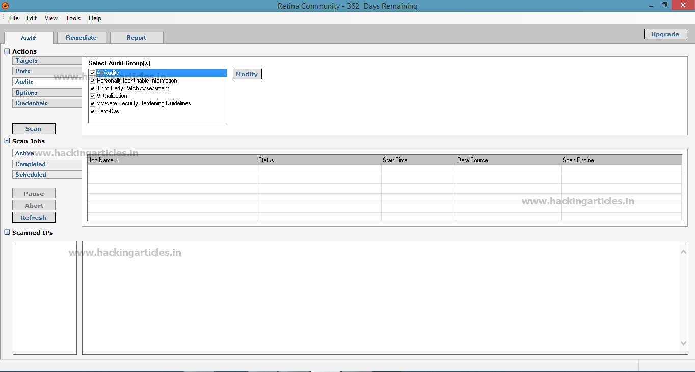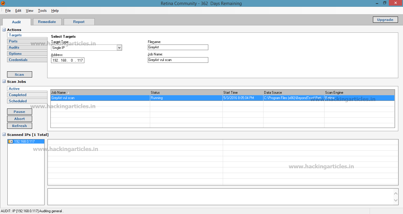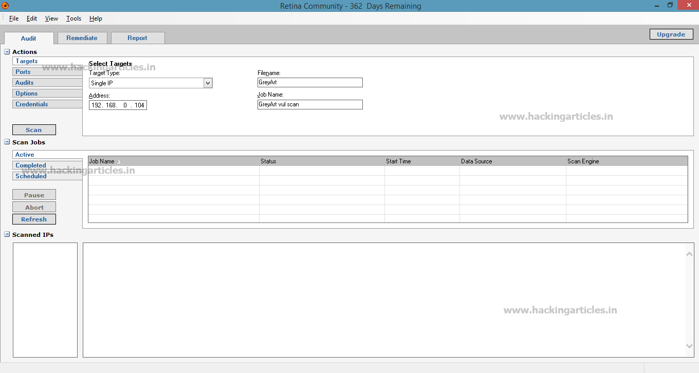 Open Retina vulnerability scanning. In audit section click on Targets select target type you can select single IP or you can also give a range of IP’s, in my case I’m scanning single IP, now give file name and job name whatever you want.