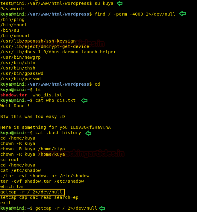 Once we get the credentials, use su to switch to a new user, now we tried to find files with sudo permissions, but no luck so we switch to the home directory of the new user and check the files. Here we have a hidden file with bash history named .bash_history having some useful information. It provides us with details about the use of getcap and setcap commands.