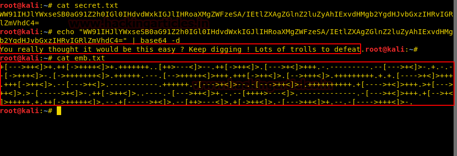 We’ll check the emb.txt, we get the brainfuck encrypted text