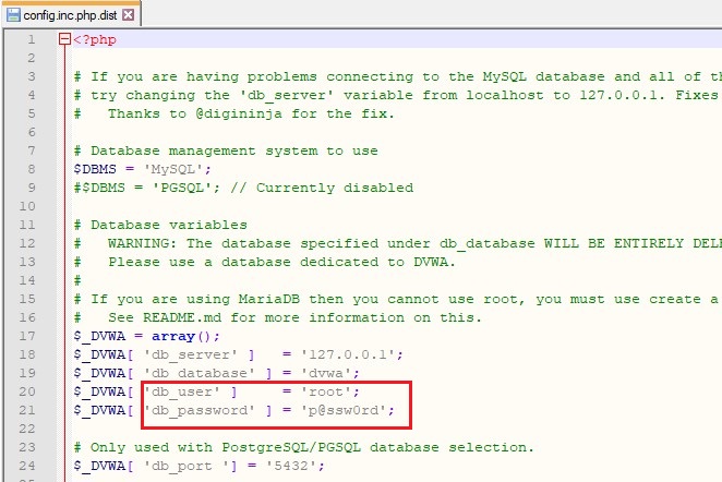 Once the dvwa is installed completely then we will navigate to C:/Xampp/htdocs/dvwa/config.inc.php.dist to change the username and password for the database.