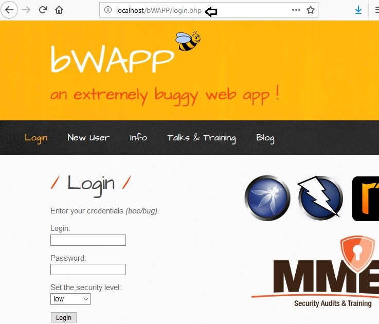 When you will login as bee:bug; you will get the portal to test your penetration testing skill