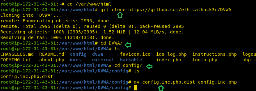 cd /var/www/html git clone https://github.com/ethicalhack3r/DVWA cd /dvwa/config mv config.inc.php.dist config.inc.php