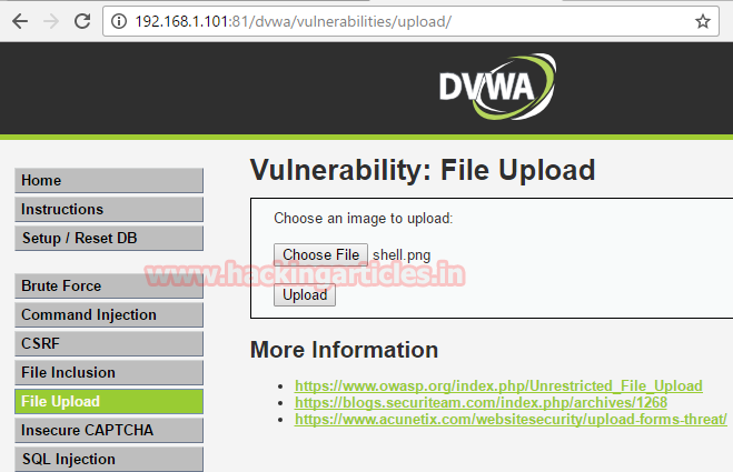 Choose vulnerability file upload to upload the malicious image in the web server application and now browse your malicious image shell.png then click on upload.