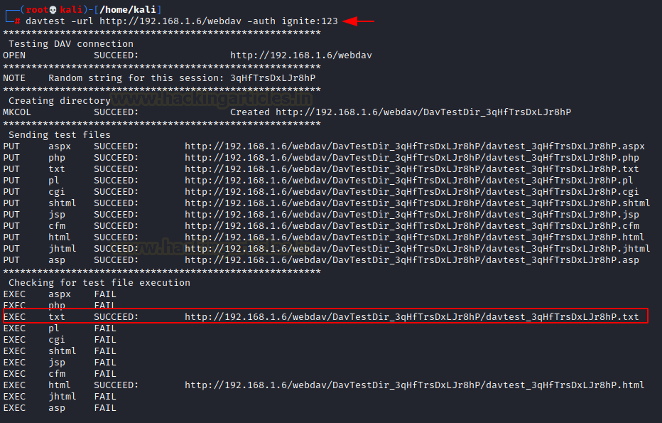 Here we get the username:password as ignite:123. Let us proceed to test the WebDAV server using davtest by uploading the test files. It generally allows the penetration testers to find any DAV services that are easily exploitable. We will then see what kind of test file successfully uploaded after the scan.