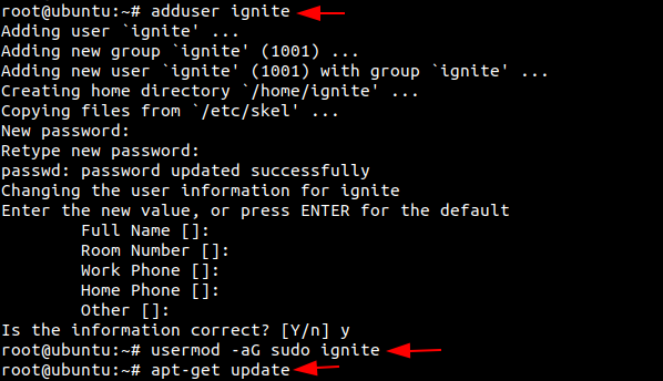 Power on your Ubuntu system as root. Let us begin by creating a user. We will create a user with the name ‘ignite’. Then we will be prompted to set a new password for the user. Retype the password to proceed. You can add the user information if you prefer, you can continue with default information. Here we need to make sure that the user has sudo privileges. As we are still logged in as root, we will now grant sudo access to the user ‘ignite’. Hence, ignite is now a Sudo User.