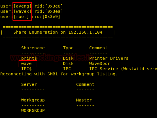We saw port 445 (smb) is open which means there may be a shared directory, so to further enumerate this as well as other ports, we tool help of Enum4Linux tool. From the results, we got some user details and a shared directory named wave.
