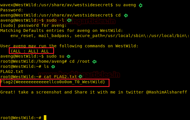 su aveng sudo –l sudo su cd /root cat FLAG2.txt