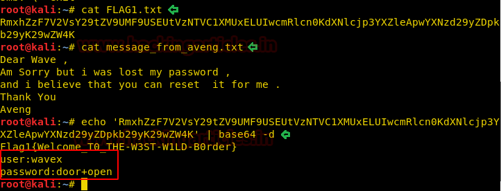We looked into the contents of these text files and found a base64 code inside the FLAG1.txt file. After decoding it we got a username wavex and a password door+open.