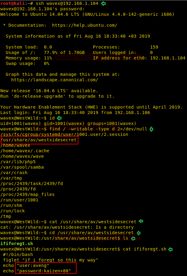 ssh wavex@192.168.1.104 find / -writable -type d 2>/dev/null cd /usr/share/av/westsidesecret ls cat ififorget.sh
