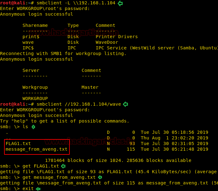 smbclient –L \\192.168.1.104 smbclient \\192.168.1.104/wave ls get FLAG1.txt get message_from_aveng.txt