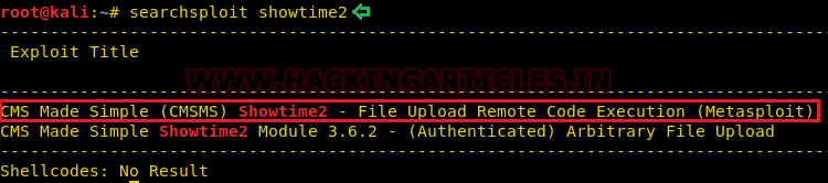 Now, to exploit the CMS, we will use searchsploit for this task. We searched the plugin in searchsploit as shown in the given image. Searchsploit gave us a Remote Code Execution Exploit. And moreover, it is a part of the Metasploit Framework.