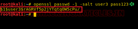 Now let’s edit /etc/passwd file. Sometimes it is not possible to execute passwd command to set the password of a user; in that case, we can use OpenSSL command which will generate an encrypted password with salt.