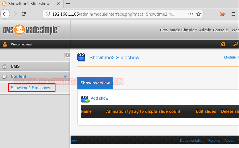And to confirm the username and password, we will enter the matched username and password in the CMS. This will generate a welcome message which shows our success in the simple list payload attack. Hereafter a bit enumeration we found out that we have a plugin installed named “Showtime2” as shown in the image.