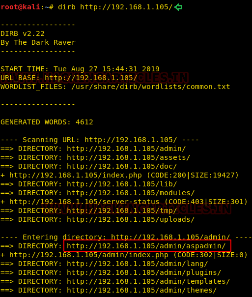 Now we further use dirb for directory enumeration. DIRB is a Web Content Scanner. It looks for existing (and/or hidden) Web Objects. It basically works by launching a dictionary-based attack against a web server and analysing the response. This gave us multiple files hosted via the CMS but aspadmin piqued our interest.